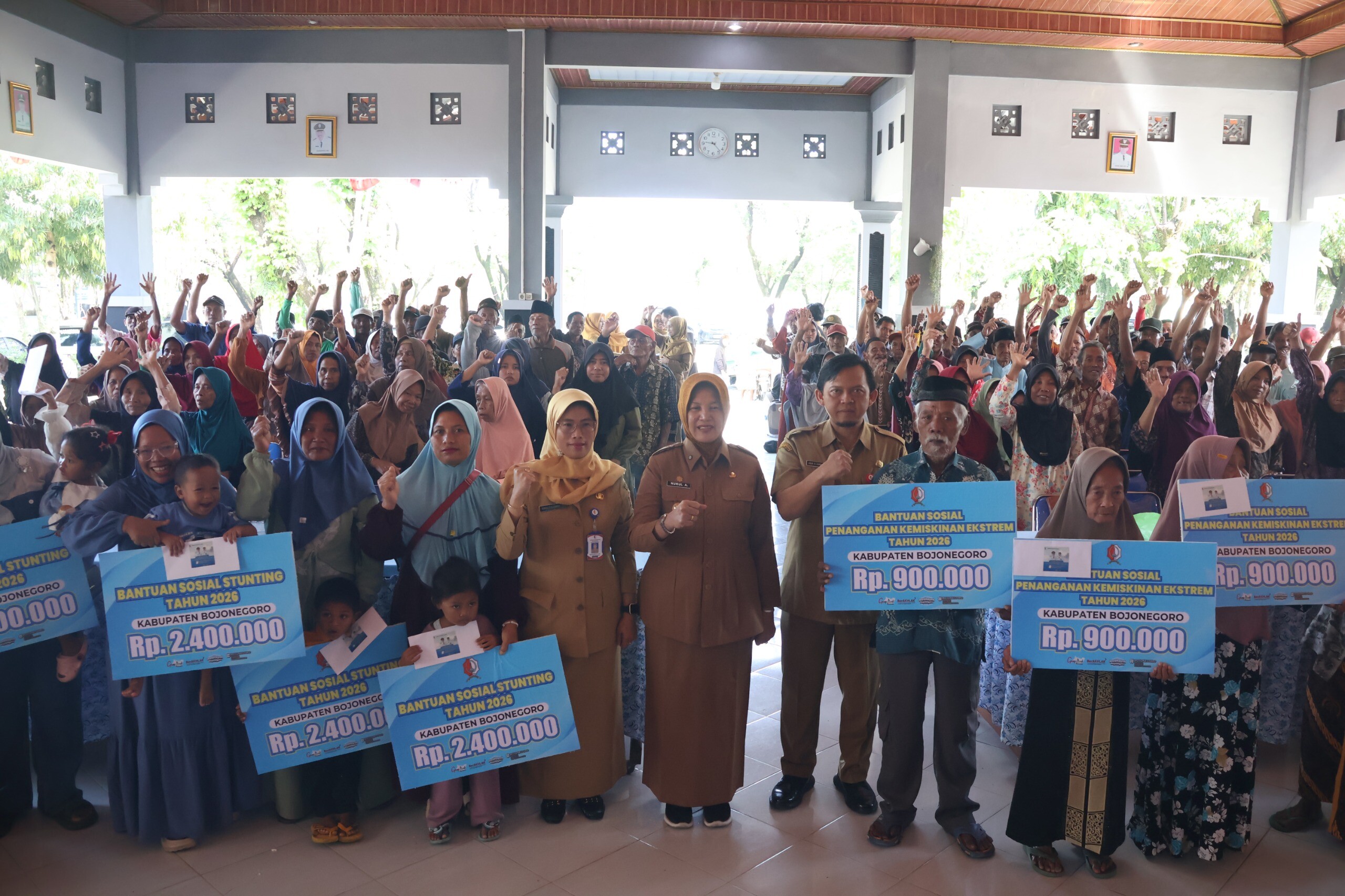 Pemkab Bojonegoro salurkan bantuan sosial (bansos) penanganan kemiskinan ekstrem dan bantuan sosial stunting di Kecamatan Gayam, Senin (13/4/2026). Penyaluran bansos dilakukan secara simbolis oleh Wakil Bupati Bojonegoro Nurul Azizah. Total anggaran yang disalurkan pada Keluarga Penerima Manfaat (KPM) sejumlah Rp 8,32 miliar.